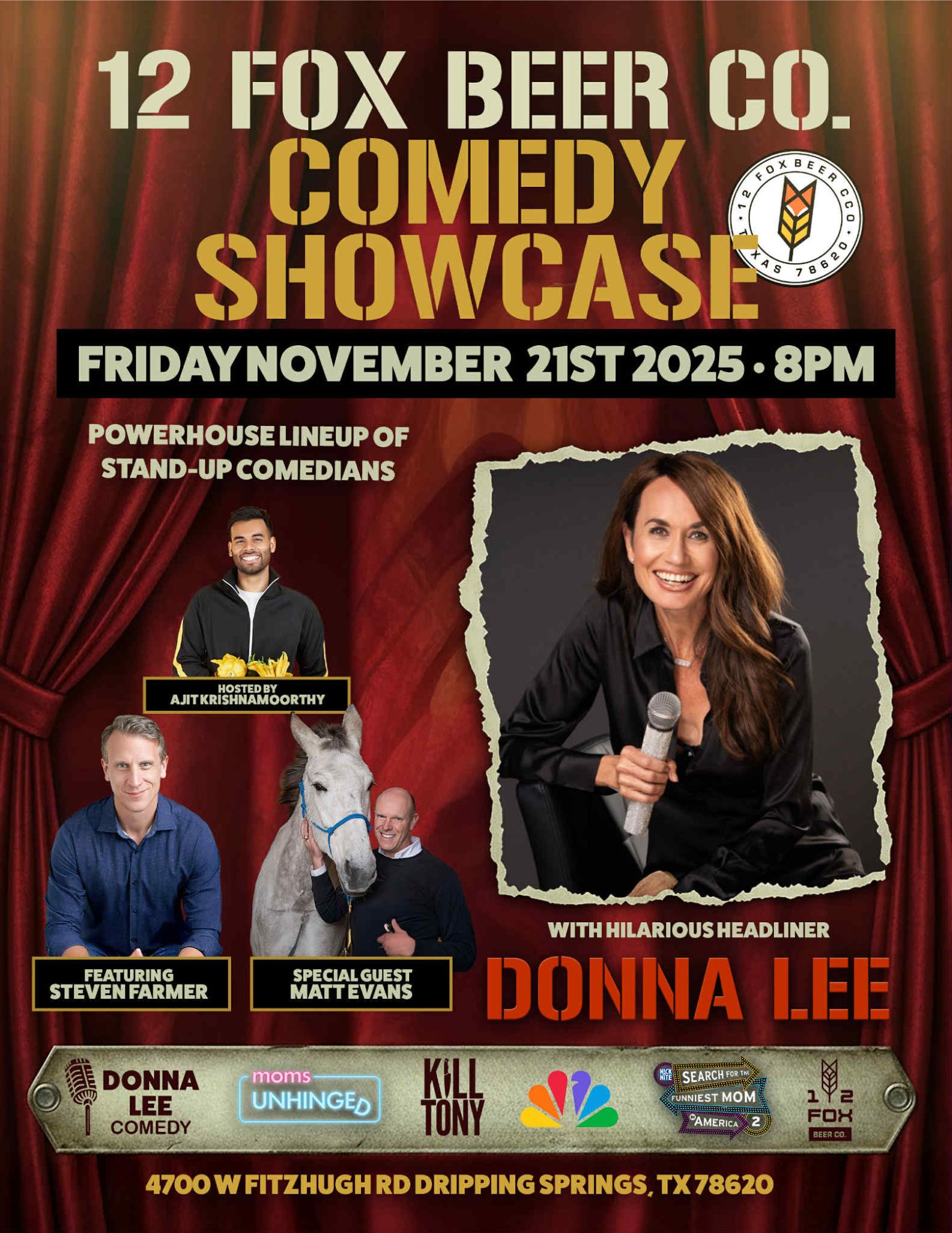 Get ready to laugh out loud under the Texas stars as 12 Fox Beer Co. hosts another Comedy Showcase on Friday, November 21, 2025 at 8 PM! This live stand-up comedy event features a powerhouse lineup led by returning headliner Donna Lee, one of the funniest touring comedians in the country.