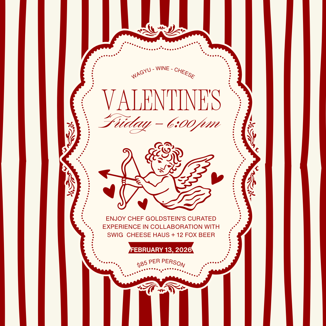 Join us for a special Valentine’s evening featuring Chef Aran Goldstein (Austin), founder of Cookandlive.co, presenting a curated dining experience in collaboration with Swig Cheese Haus and 12 Fox. Enjoy a thoughtfully crafted menu highlighting wagyu, artisan cheese pairings, and the debut of our NEW 12 Fox Red Blend.