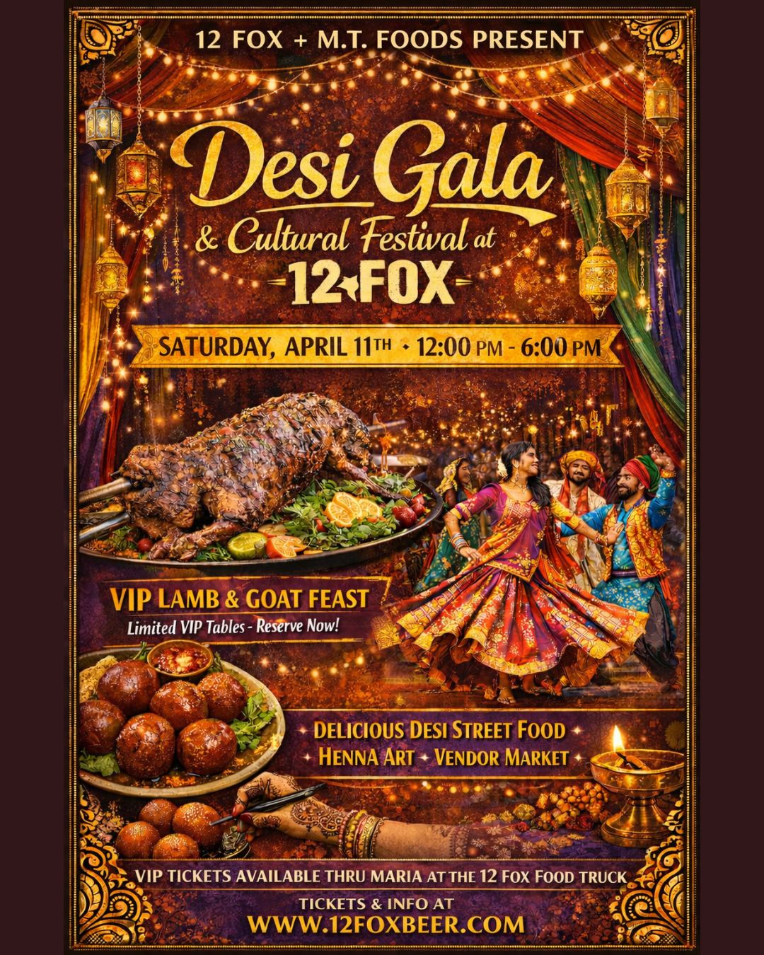 Hosted in the scenic 12 Fox Biergarten, this lively festival brings together authentic South Asian cuisine, cultural performances, live music, artisan vendors, henna art, and a special VIP culinary feast prepared by Maria and the team from M.T. Foods.