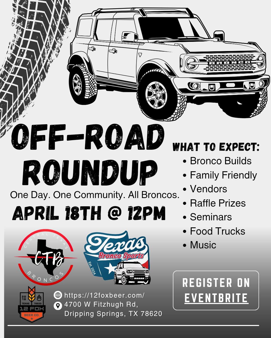 Looking for the ultimate Ford Bronco event near Austin, Texas? Join us at 12 Fox Beer Co. for the Off-Road Roundup on April 18th at 12 PM—a full day dedicated to Bronco builds, off-road culture, and community.